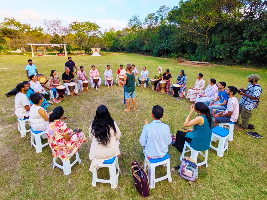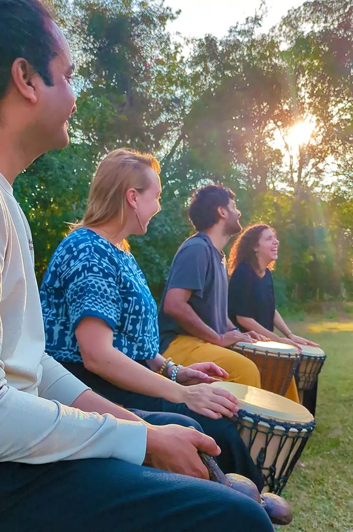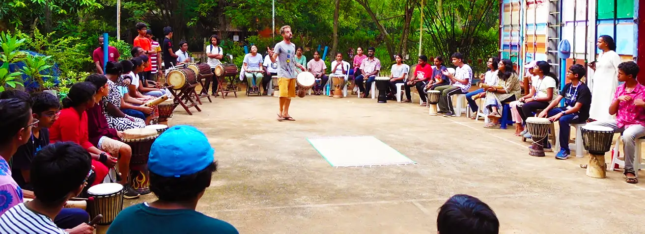Our team of SVARAM musicians is always happy to invite visiting groups, teams, classes, and students of all ages into the playful and fun-filled experience of grooving together. Learn to listen to your own pulse, feel the beat, relate and get in the groove with the group, respond to a tease, laugh off an off-beat stumble over mistakes, overcome challenges and join in into the recharging energy of musical rhythmic play and nonverbal, creative, interactive expression and total fun.
